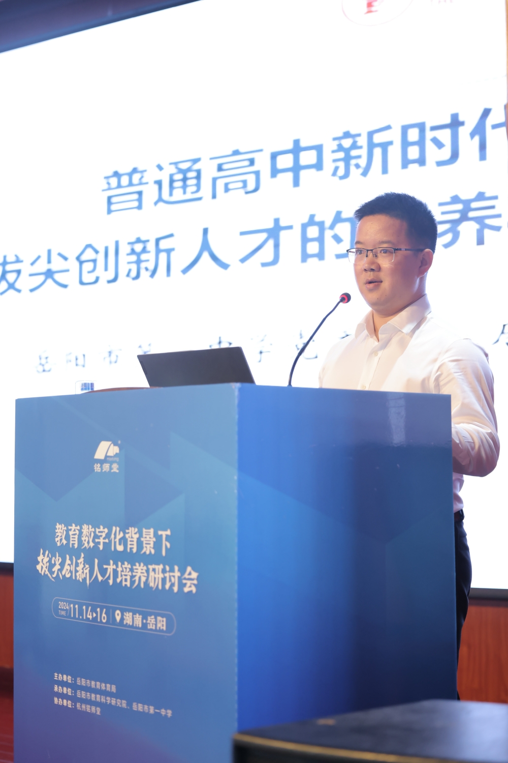 研讨会中,北京大学教务长办公室主任孙华教授,杭州铭师堂教育硏究院主任高铂凯,广西武鸣高中党委书记谢显恒,重庆巴蜀中学教育集团督学周刘波,华东师范大学第二附属中学校⻓周彬,岳阳市一中党委委员唐焱,分别作了“在智能时代重塑高等教育、推动教师发展”“新时代下高中学校思路变革”“文化打造创品牌,精细管理出高质”“新高考背景下教学管理提质增效的实施路径”“拔尖创新人才早期培养的实践与思考”“普通高中新时代拔尖创新人才的培养与思考”主题报告。