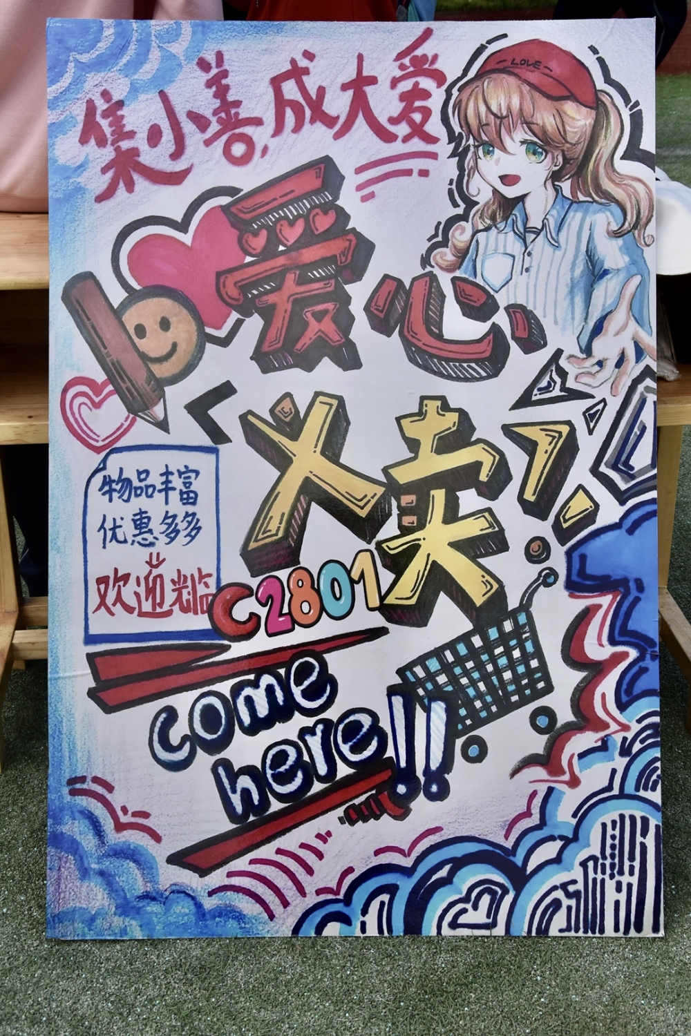 爱是传递。驻足在操场中间,回望各个摊位之前。春日的阳光温柔地洒在义卖活动现场。摊位上负责人尽显神通,载歌载舞,只为吸引更多顾客。跑道边,海报前;宣传声,交谈声共同奏响一曲和谐乐章。一件件手工艺品在阳光的轻抚下熠熠生辉,一件件出售的商品也在此刻仿佛有了温度。