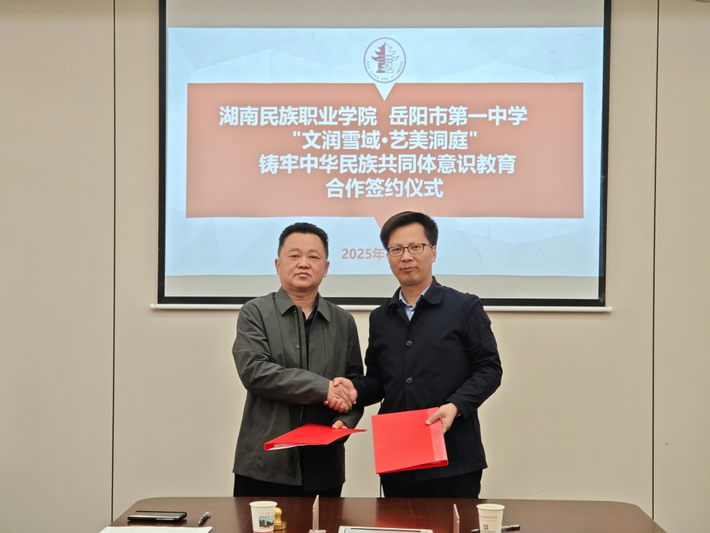 为全面贯彻党的教育方针和民族政策,切实推动铸牢中华民族共同体意识教育,主动融入推动西藏教育强区建设,不断提高西藏班办学质量和水平,经友好协商,我校与湖南民族职业学院决定开展“文润雪域·艺美洞庭”铸牢中华民族共同体意识教育合作,力争通过教育资源互通、文化交融共建,谱写新时代民族团结教育的篇章。3月25日,我校与湖南民族职业学院正式签署协议,湖南民族职业学院党委委员、宣传统战部部长段志勇、岳阳市一中党委书记郭光前及两校相关人员出席签约仪式。