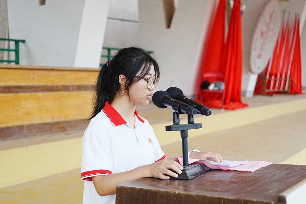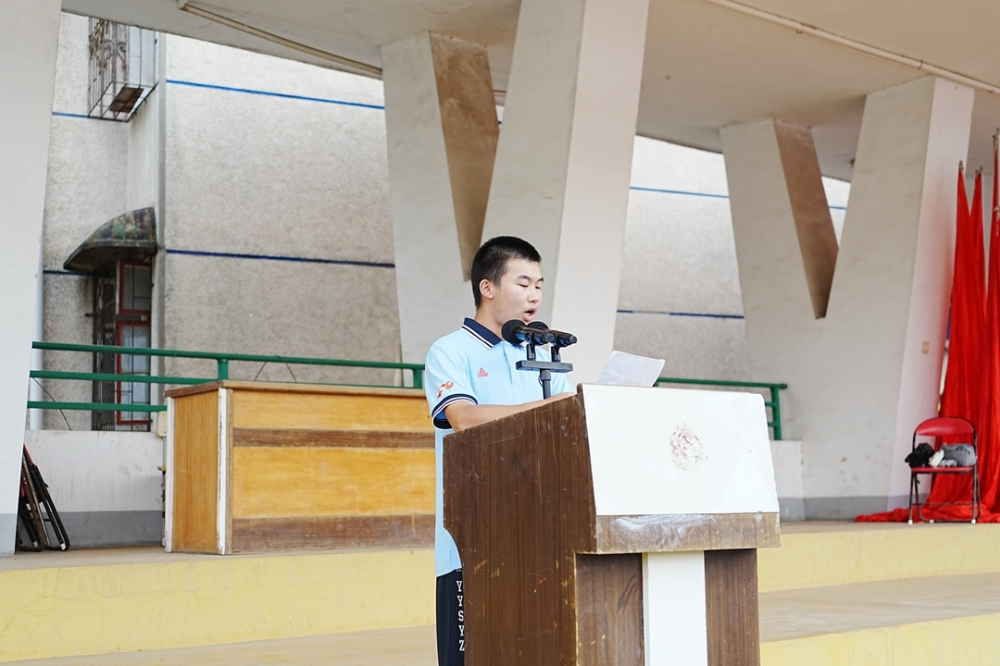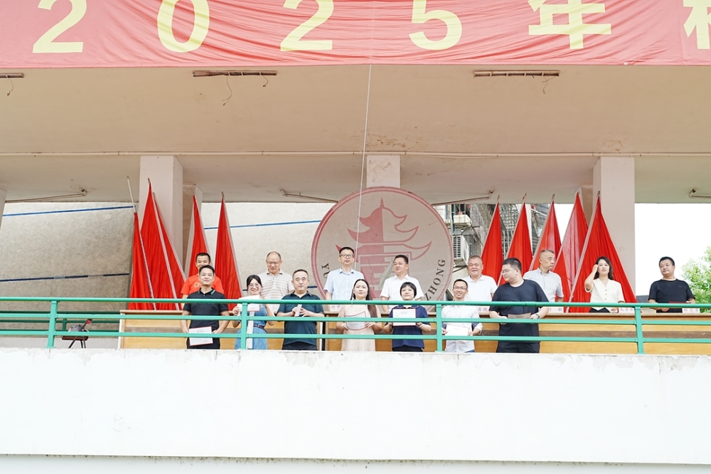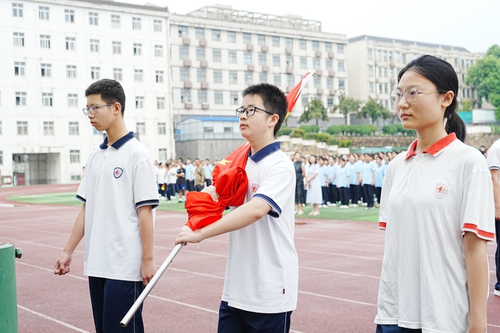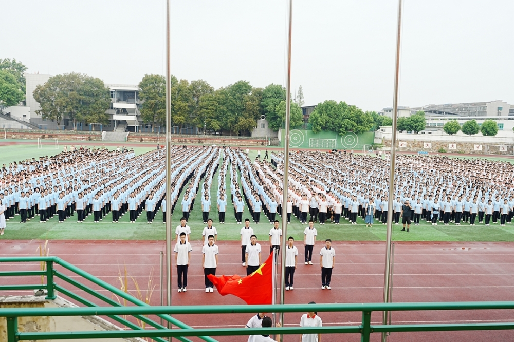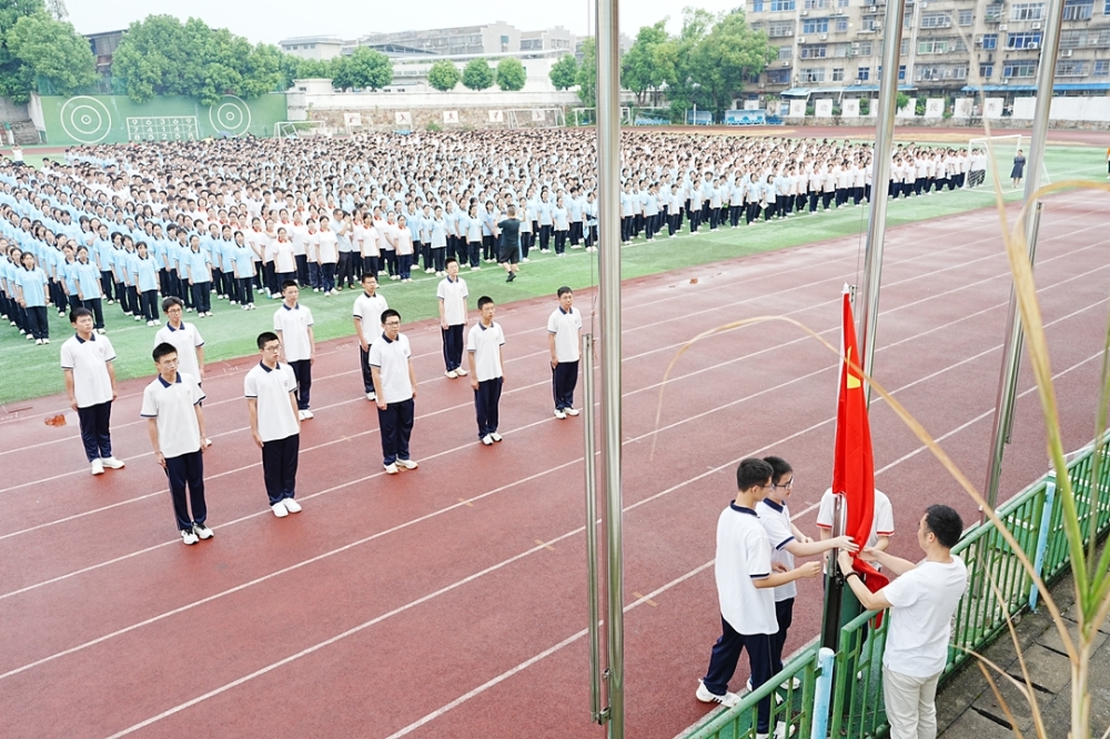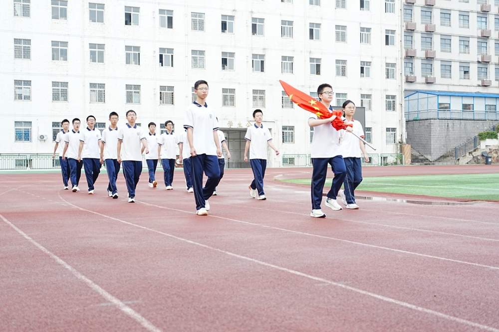 全体师生肃立操场,注视高二742班国旗护卫队庄严出旗——旗手李泽俊肩扛五星红旗,在护卫下正步前行。国歌奏响,红旗冉升,全校目光炽热,正式拉开新学期序幕。