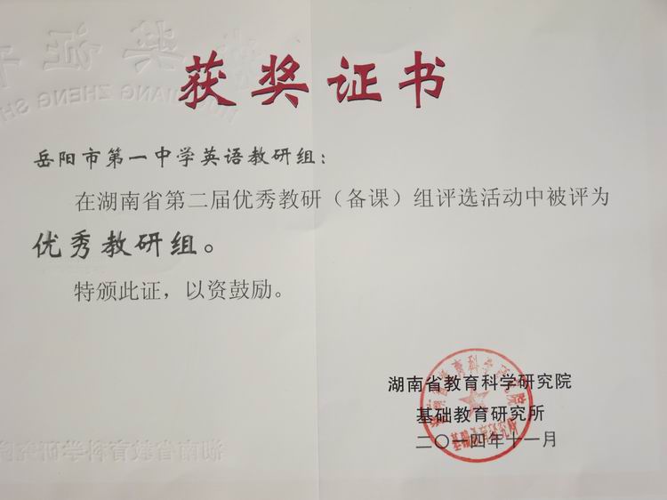 ??? 在刚刚结束的湖南省第二届全省中小学教研(备课)组建设研讨会上,我校英语组被湖南省教育科学研究院和基础教育研究所评为“优秀教研组”,英语教研组组长李娟老师代表学校领奖。