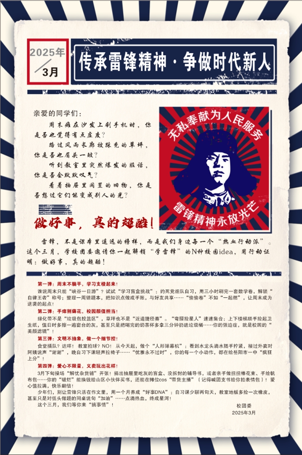 三月春风暖人心,雷锋精神代代传。在毛泽东同志"向雷锋同志学习"题词62周年之际,通过主题班会、千人签名、青年党校、爱心义卖等系列活动,共青团岳阳市一中委员会组织全校师生共同奏响了新时代青春奉献的乐章。