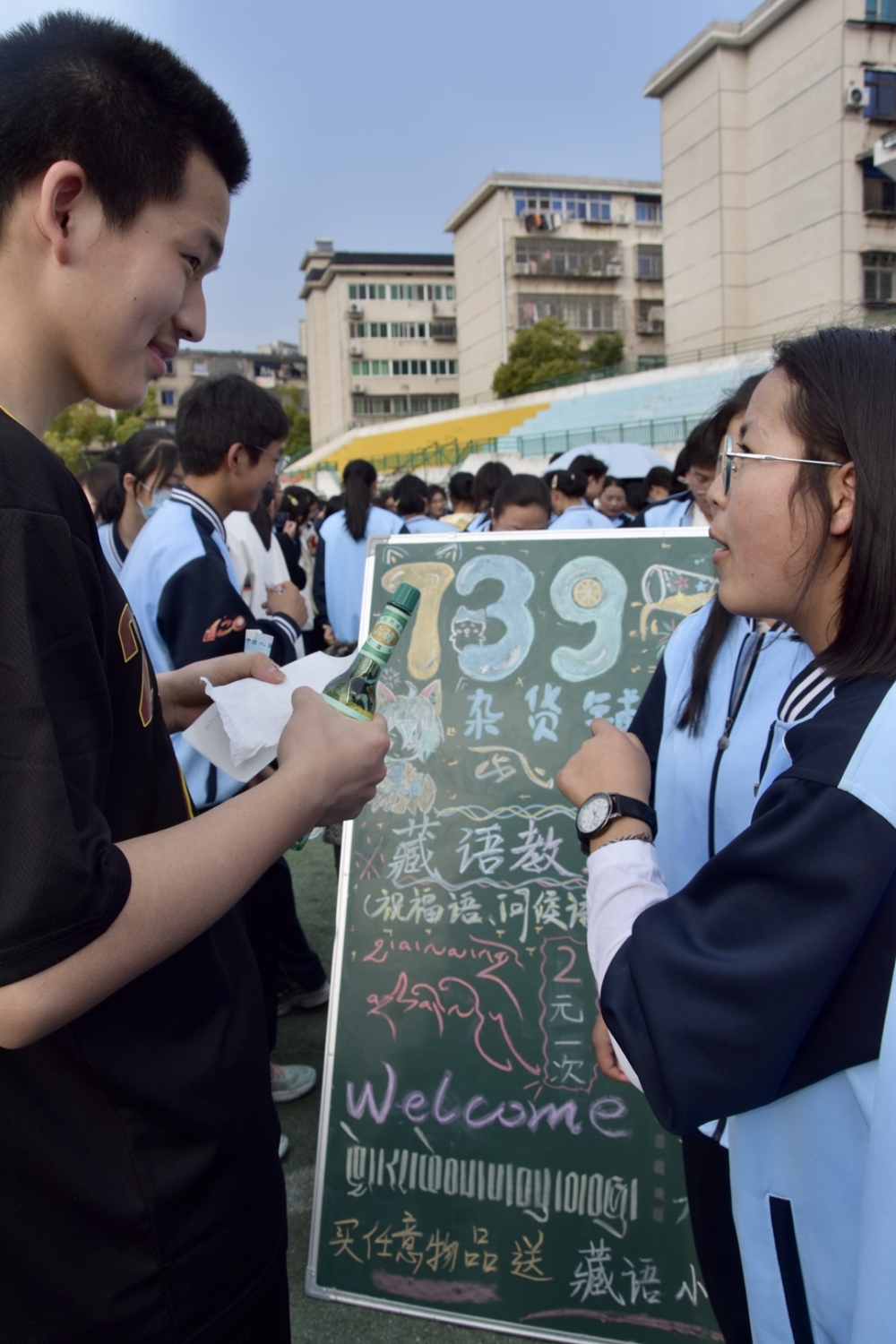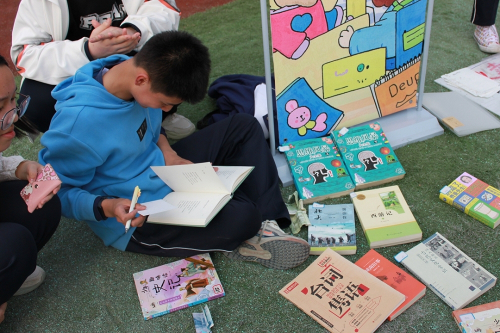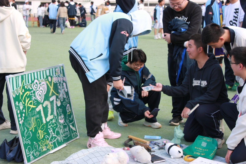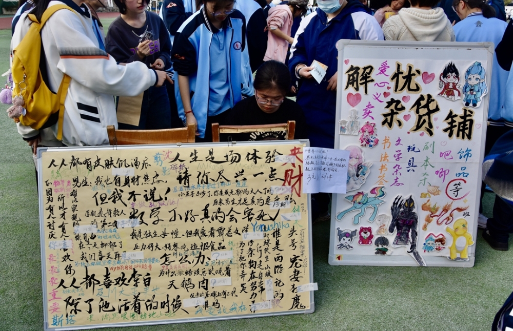 为了吸引“顾客”,各班还精心设计了宣传海报,有的班级甚至准备了才艺表演,现场气氛热烈非凡。值得一提的是,本次活动特别增设了丰富多彩的特色活动内容,为义卖增添了更多趣味和意义。其中,藏语教学摊位吸引了众多同学的目光。来自西藏的同学们热情地向大家介绍藏语的基本发音和常用词汇,并现场教授简单的藏语对话。许多同学兴致勃勃地参与学习,感受藏族文化的独特魅力。此外,丰富多样的情绪价值提供也成为本次义卖的一大亮点。有的班级推出了“心灵树洞”服务,同学们可以将自己的烦恼和心事写在纸条上,投入树洞中,由志愿者倾听并提供温暖的安慰和建议;还有的班级设置了“微笑加油站”,同学们可以在这里写下自己的心愿和祝福,贴在心愿墙上,与他人分享快乐和希望。这些活动不仅让同学们在义卖中感受到情感的交流与共鸣,更让大家在忙碌的学习生活中找到了一份心灵的慰藉。