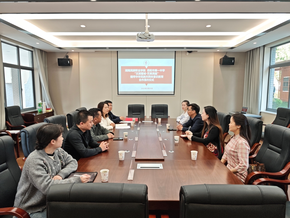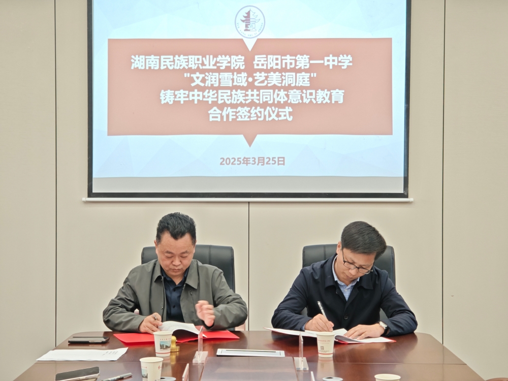 为全面贯彻党的教育方针和民族政策,切实推动铸牢中华民族共同体意识教育,主动融入推动西藏教育强区建设,不断提高西藏班办学质量和水平,经友好协商,我校与湖南民族职业学院决定开展“文润雪域·艺美洞庭”铸牢中华民族共同体意识教育合作,力争通过教育资源互通、文化交融共建,谱写新时代民族团结教育的篇章。3月25日,我校与湖南民族职业学院正式签署协议,湖南民族职业学院党委委员、宣传统战部部长段志勇、岳阳市一中党委书记郭光前及两校相关人员出席签约仪式。