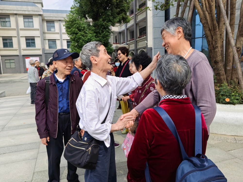 同忆六十岁月,共度八十华诞。4月19日,春意盎然的岳阳市一中迎来了一群特殊的“家人”——51位年逾八旬的1965届校友重返母校。跨越近六十载光阴,这群白发苍苍的“老同学”相聚在熟悉的校园,共叙同窗情谊,追忆青葱岁月,为春日的校园增添了一份跨越时代的温情。